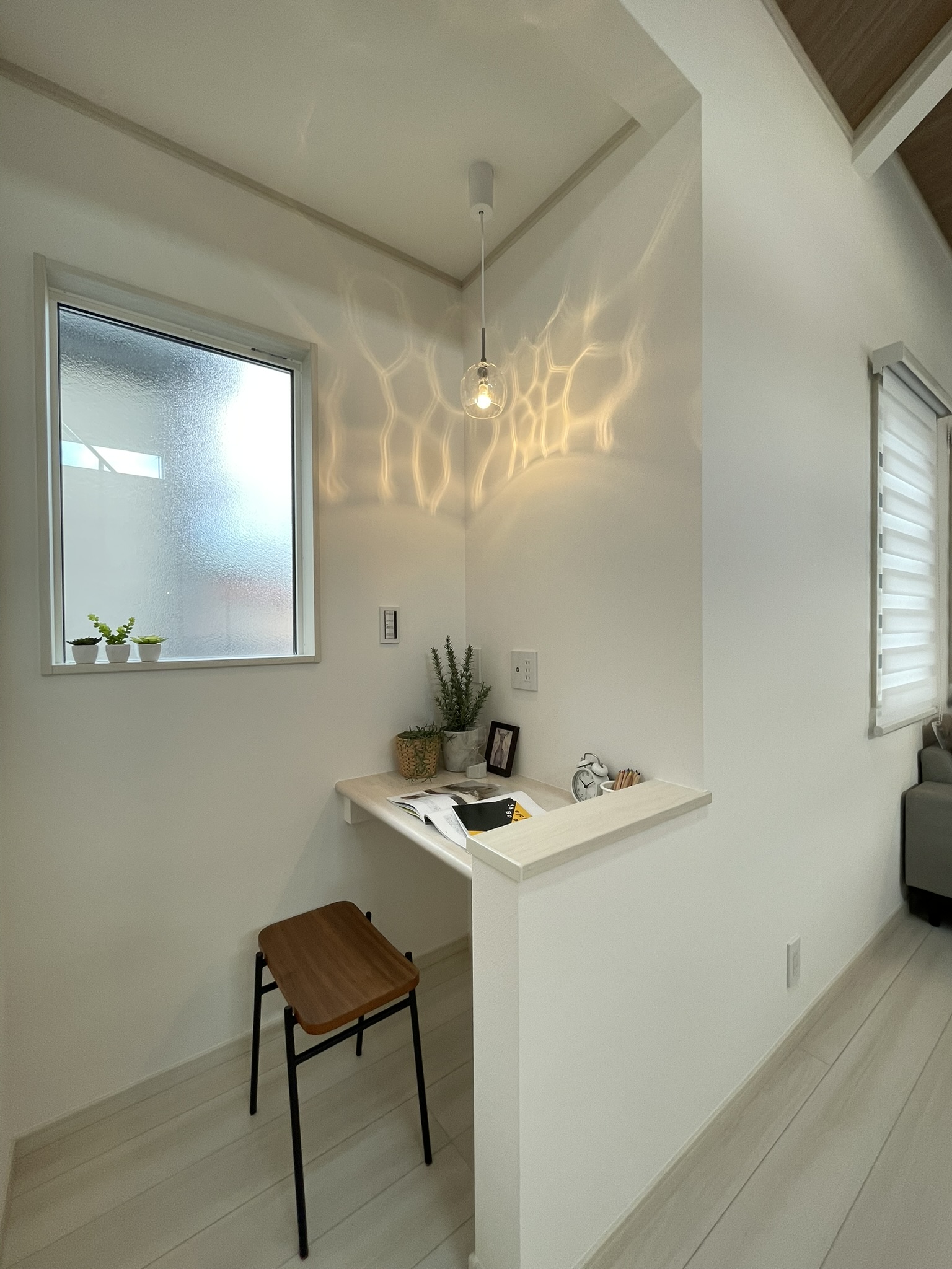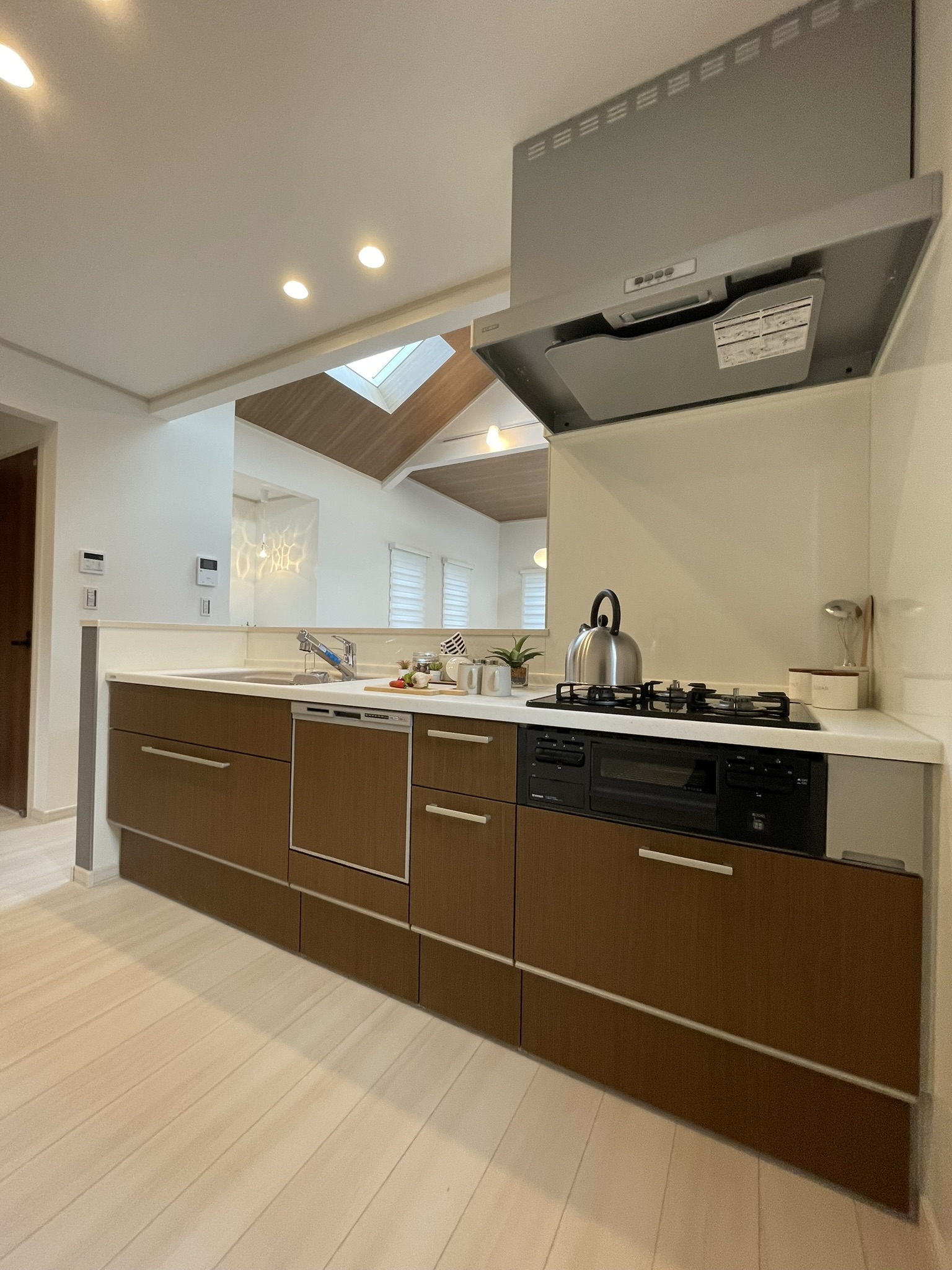 勾配天井に取り付けた天窓と周囲の目線に配慮した小窓から差し込む光が家族団欒を明るく照らし、2.9mある天井高が開放感あふれる空間を作り出します。